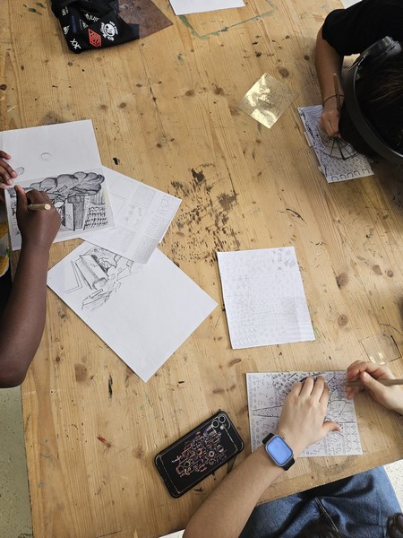 Une initiation à la technique de la taille douce leur a permis d'expérimenter de nouveaux outils pour produire une image. Pour certains élèves c'était également la découverte d'un lieu dédié aux arts de l'estampe :l'URDLA de Villeurbanne. La thématique qu'ils ont abordé à travers cette technique était le corps lieux ou comment le corps vit l'espace dans lequel il se trouve: en fusion, en opposition, en contradiction. tout est histoire de point de vue.