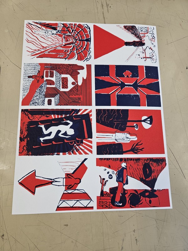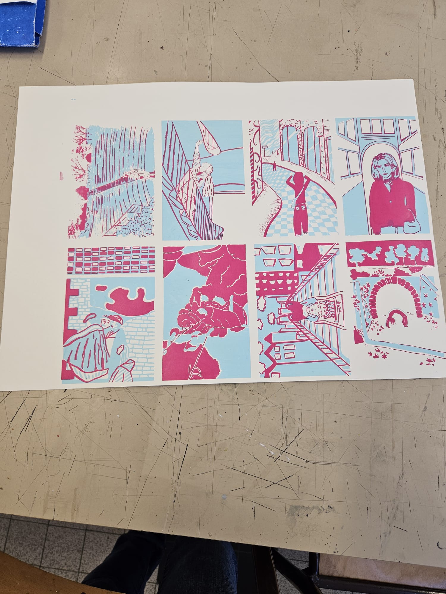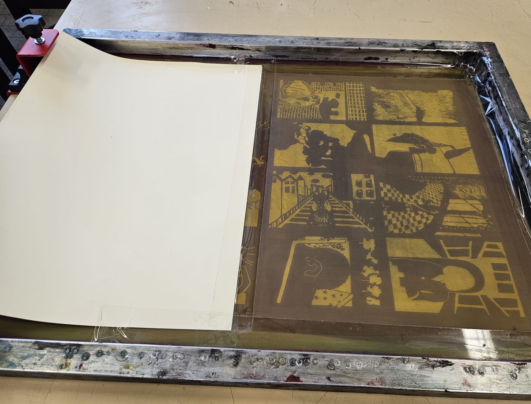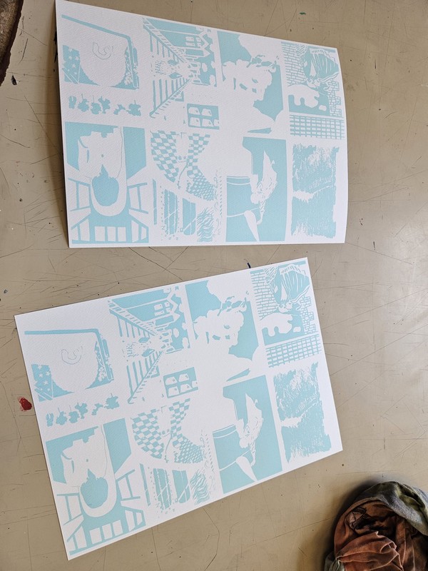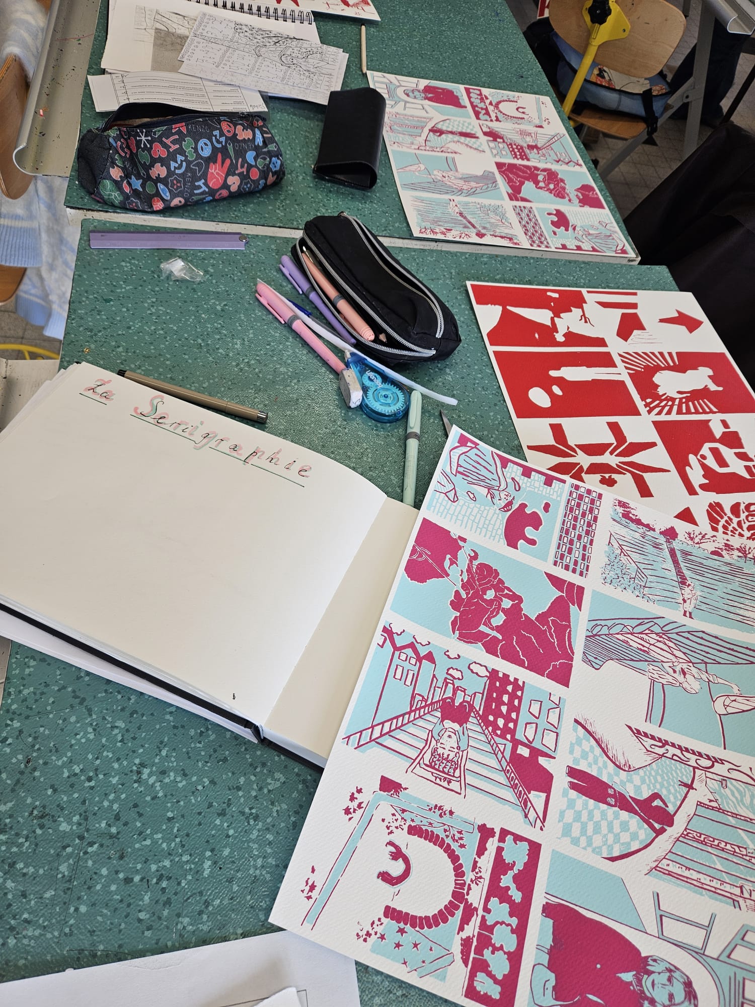 Le projet s'est poursuivi au lycée Ampère en salle 500, où ils ont découverts une autre technique d'impression: la sérigraphie. Marie-Eve Matichard, dit aussi Mary Poppink les a aidé pendant 3 séances de 2heures à élaborer des cartes réalisées en technique de sérigraphie. Le projet a permis aux élèves de gagner en précision dans le travail de dessin et de comprendre la rigueur de la méthode utilisée.